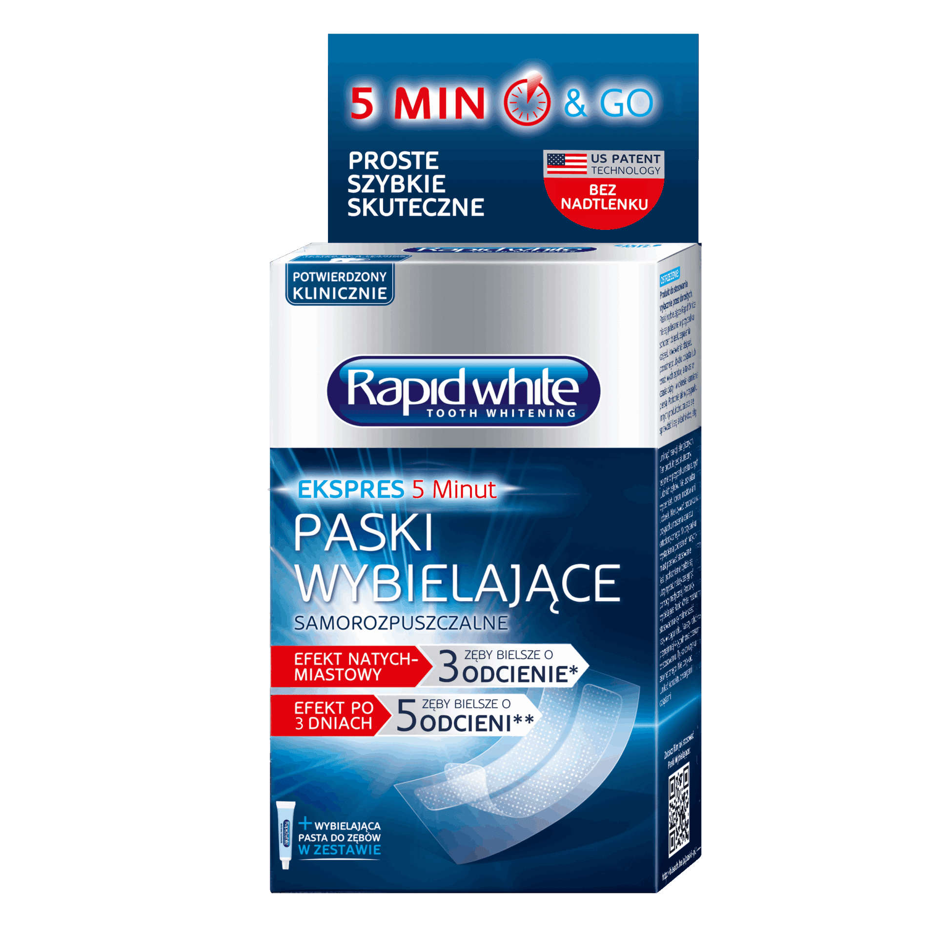 Dzięki zastosowaniu innowacyjnej technologii paski wybielające Rapid White ulegają rozpuszczeniu w jamie ustnej –paski stanowiąszybką i skuteczną metodę wybielania zębów bez potrzeby użycia nadtlenku wodoru.